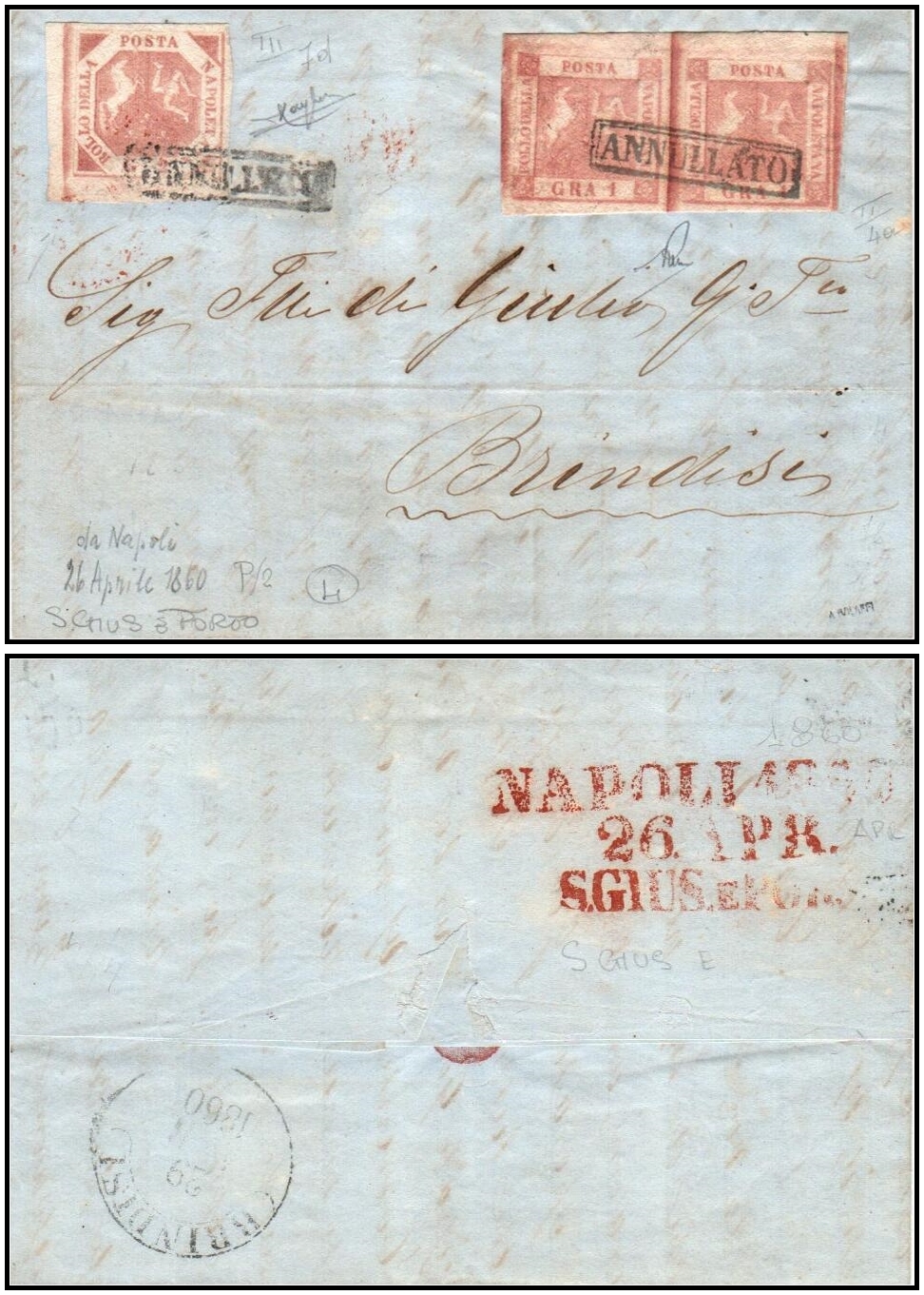 439 Used , veryfine , Sheet Letter   imageItalian States, Napoli 1860, Folded letter Napoli to Brindisi franked with 1gr. rose-pink horizontal imperf pair (Sassone # 4)  and 2gr.  pinkish brown, ( Sassone # 7)  both struck with boxed ‘ANNULLATO’ (Cancelled) handstamps on front—typically applied to high-value or long-distance mail. The route from Naples to Brindisi was significant, and the combined stamp value corresponds to higher postal rates for such mail. On reverse, a rare three-line red handstamp reads:“Napoli 1860 / 26 Apr. / S. Gius. Poroo” (San Giuseppe Poro), alongside a black Brindisi circular date stamp (CDS) also dated 26 April 1860. Stamps and cover bear an expert certificate signature nearby, with a certified handstamp at bottom right front.