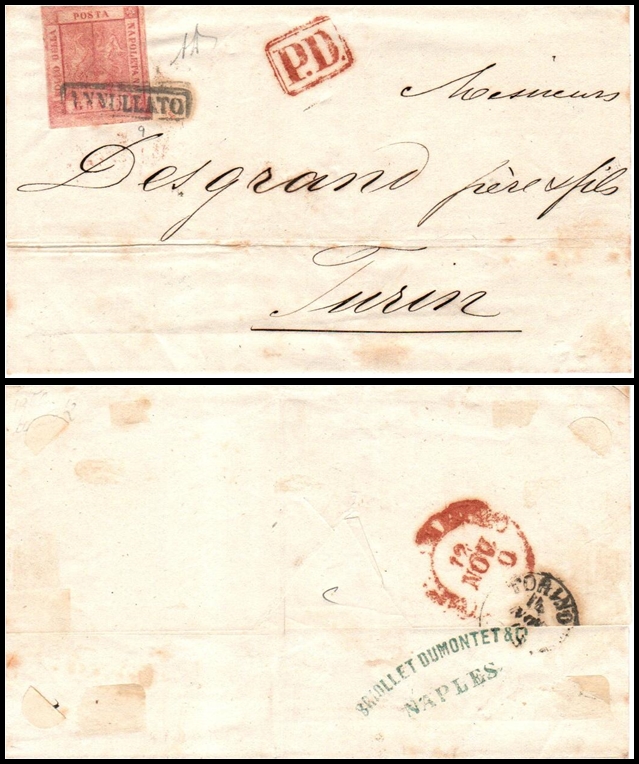 438     imageItalian States, Napoli, 1859 – Folded letter from Nepales to Turin, franked with 5 Grana carmine-pink, II Plate, canceled with rectangular “ANNULLATO” handstamp. Manuscript “PD” in red indicates prepaid. Reverse with “BRIOLLET DUMONTET & G NAPLES” sender handstamp and “Torin 19 NOV” circular postmark. Stamp expertized with signature beside the stamp, identified as Sassone No. 9. Scarce and attractive.