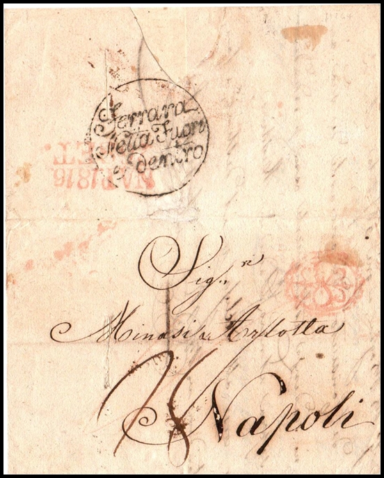 440 Used , veryfine , Sheet Letter   imageItaly, 1816 (26 Sept) — Disinfected Cover from Trieste to Napoli via Ferrara Folded entirely bearing a pink flower-style health cachet on the front and disinfected inside/outside by the Ferrara sanitary authority, marked “Netta Fuori e Dentro”. Red arrival backstamp on reverse dated 26 Sept 1816. A fine example of early 19th-century quarantine mail, combining an intriguing floral cachet with rare Papal State disinfection handling.