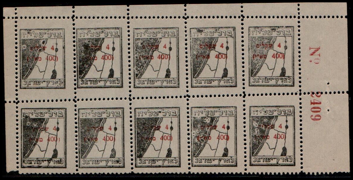 214 mintneverhinged , postcard , Sheet Letter   imageJudaica JNF 1940s Old Label Overprinted Aliya Stamp Palestine Map 4 Shekels (400 מא"י ) bloock of 10 stamps