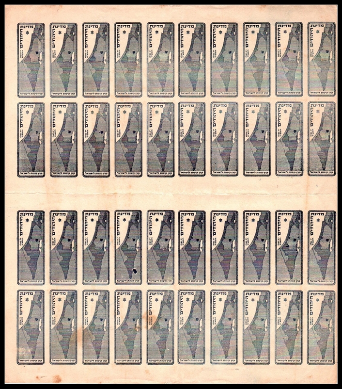 This sheet represents a trial of the final issued paper. Fine and very rare, ideal for collectors of JNF and early Israeli philately.