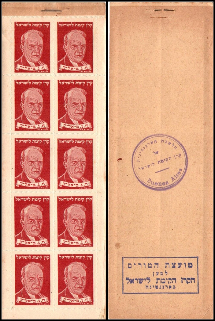 JNF 1953 Argentina — Zionist Personalities: Bialik. Complete booklet with cover pane cancelled by KKL circular cachet (Buenos Aires) and boxed cachet: Teachers' Council for the KKL in Argentina (Hebrew). Pane of 10 × 10
