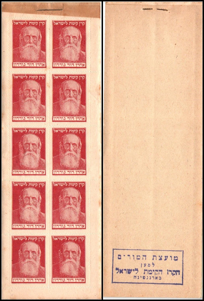 JNF 1953 Argentina — Zionist Personalities: Gordon. Complete booklet with cover pane cancelled by KKL boxed cachet: Teachers' Council for the KKL in Argentina (Hebrew). Pane of 10 × 10 stamps, Rochlin Ar71–80. MNH. Cat $600.