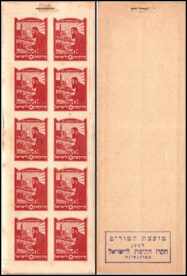 JNF 1953 Argentina — Zionist Personalities: Herzl. Complete booklet with cover pane cancelled by KKL boxed cachet: Teachers' Council for the KKL in Argentina (Hebrew). Pane of 10 × 10 stamps, Rochlin Ar81–90. MNH. Cat $600.