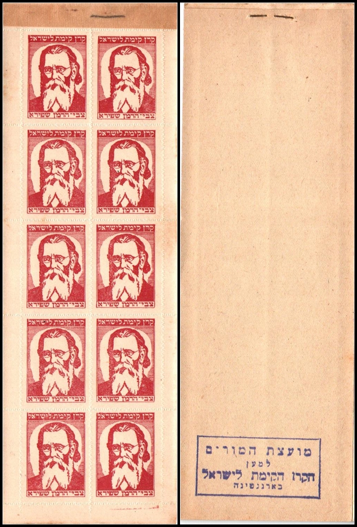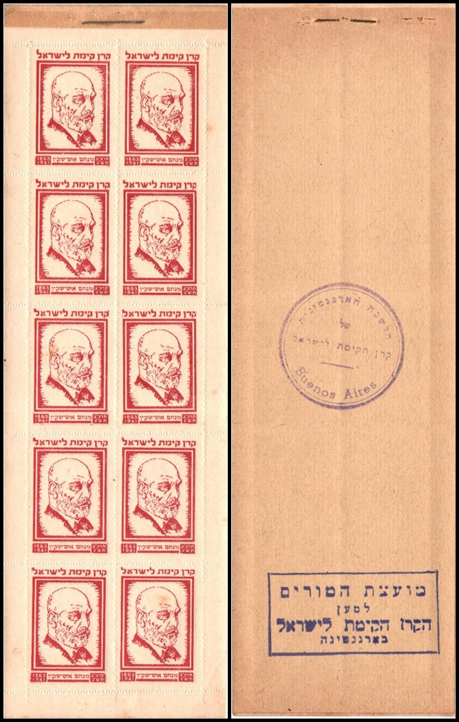JNF 1953 Argentina — Zionist Personalities: Ben-Yehuda. Complete booklet with cover pane cancelled by KKL c boxed cachet: Teachers' Council for the KKL in Argentina (Hebrew). Pane of 10 × 5 stamps, Rochlin Ar51–60. MNH. Cat