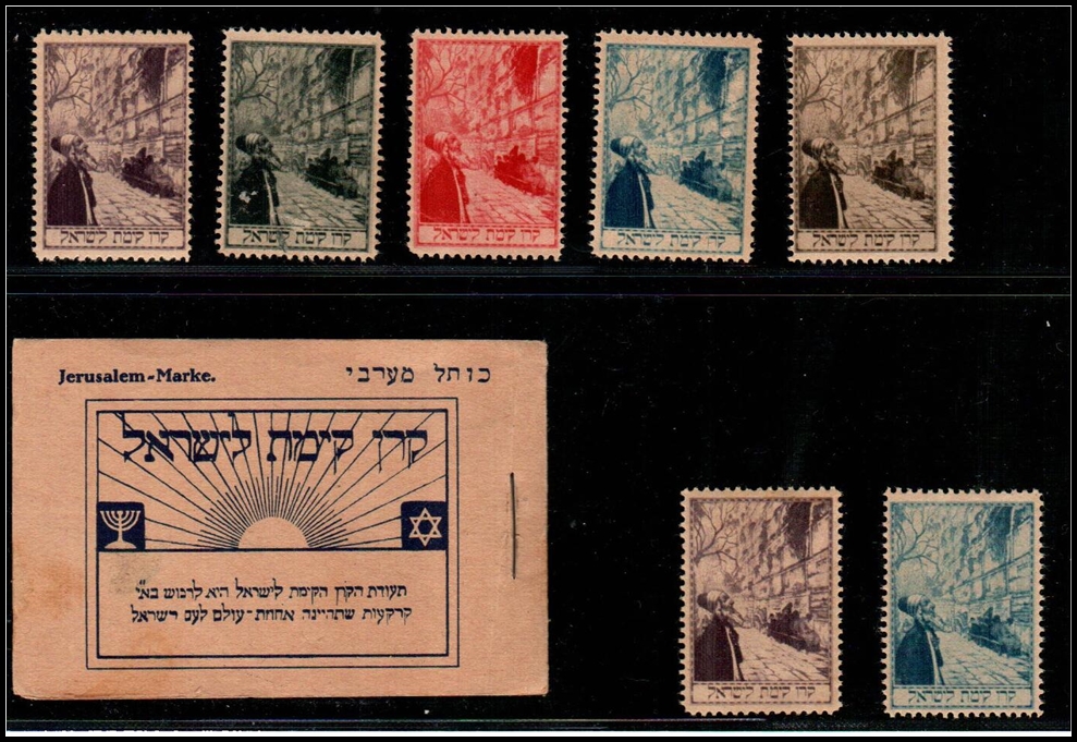 JNF Germany 1913 — 2500th Anniversary of First Temple’s Destruction.Designed by E.M. Lilien, depicting a Jew at the Western Wall. Lot of 7 different stamps (Rochlin 28×2, 29, 30, 31×2, 32), two without gum, plus cover..
