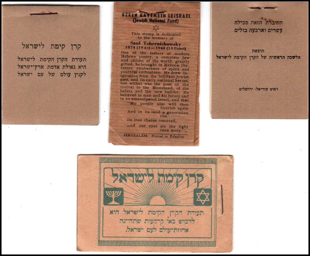 KKL 1915–1944, Lot of 4 Booklets: – 1915 David Wolffsohn, Rochlin 45–49– 1933 Bialik & Arlosoroff (2 booklets), Rochlin 267–272 (2)– 1944 Shaul Tchernichovsky, Rochlin 894–896.