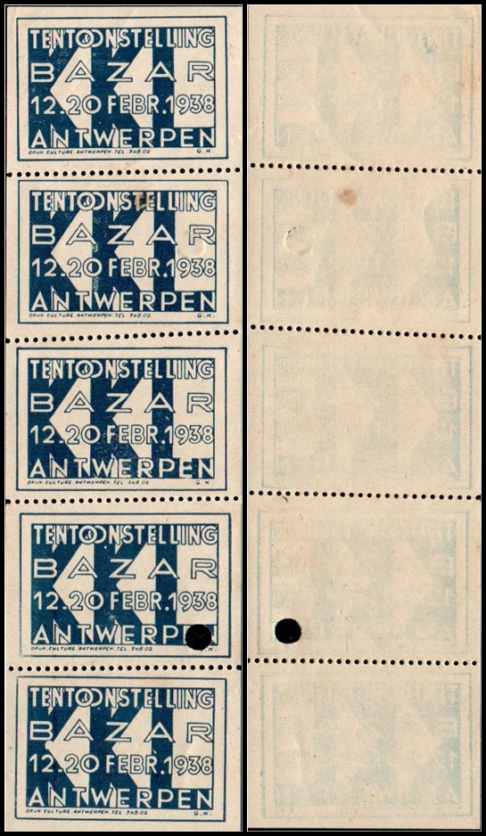 JNF Belgium 1938 – Bazaar Stamp Booklet Pane (1×5)A complete booklet pane of five stamps, each inscribed in Flemish: “Tentoonstelling Bazar, 12–20 Febr. 1938, Antwerpen” (Exhibition and Bazaar).