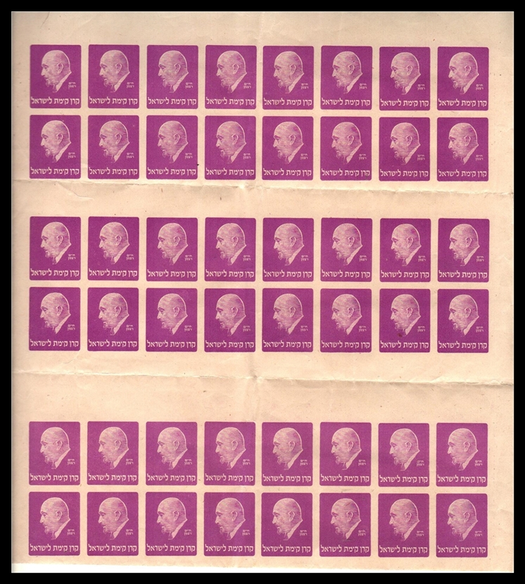JNF 1944 Chaim Weizmann Sheet. features four blocks of 16 stamps each (8 rows by 2 columns), separated by three horizontal gutters—the central gutter being wider than the others. The sheet shows three folds along the gutters