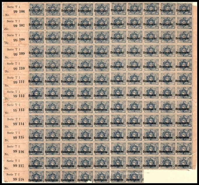 JNF 1903 , Zion Sheet with “Dienstsache” Overprint, Series T1 (Turkey). Sheet of 127 stamps from Series T1 (Turkey) with left-side tab. Overprinted "Dienstsache." Listed in Rochlin as 2LLa. Original gum.