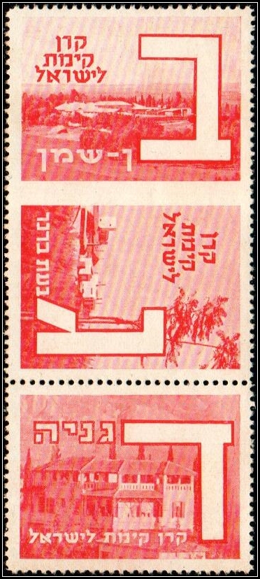 1950 JNF "Aliyah" Issue – Proofs, Vertical strip of 3 imperforate stamps in black, inscribed with the biblical quotation from Isaiah: “And I will gather you from all the lands.”Rochlin #1356-1.