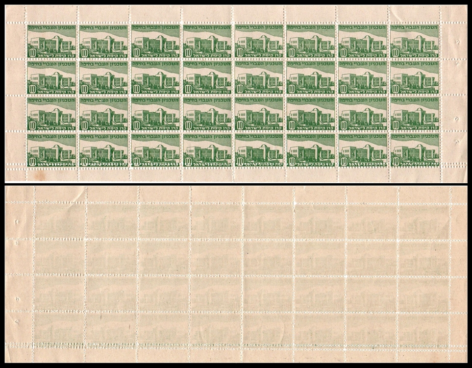 JNF 1945 , Technion Issue, sheet of 32. Rochlin #929, 10m green on gray paper, arranged 8x4. Features notable double perforation on bottom row. Original gum, MNH.