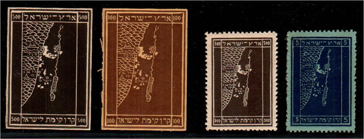 1928-1935 JNF. Map of the Land of Israel. embossed. imperforate. Rochlin # 174, 176, and 384, 389 perf. all MNH.