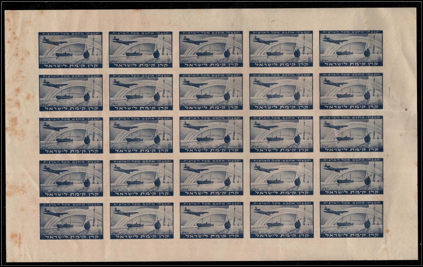 1950 JNF Issue, Imperforate sheet of 25 (5 × 5) stamps, blue, inscribed with the biblical quotation from Isaiah, "And I will gather you from all the lands." Catalogued Rochlin #1356. Original gum with minor faults, fine