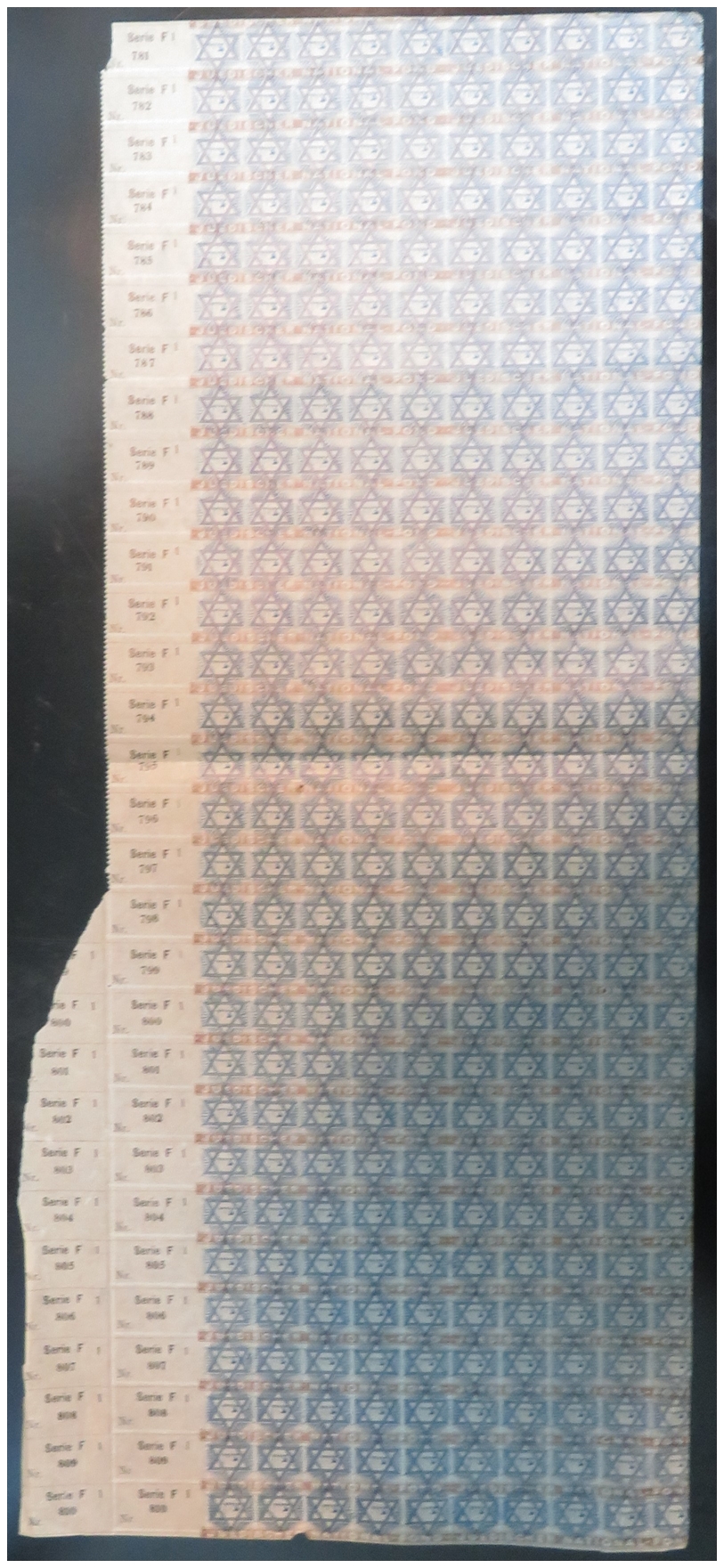 sheet of 150 stamps, Rochlin #1B, with Serie F1 tabs, originating from the French printing (rows numbered 646 to 660). This version features the iconic Star of David and the word Zion in bold design. Original gum, with minor faults. A scarce and