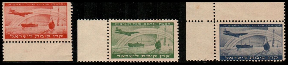 JNF Israel, 1950 Aliyah Issue, Set of 3 labels, Mint Never Hinged (MNH), inscribed “And I will gather you from all the lands” in Hebrew. Catalog 1136–1138.