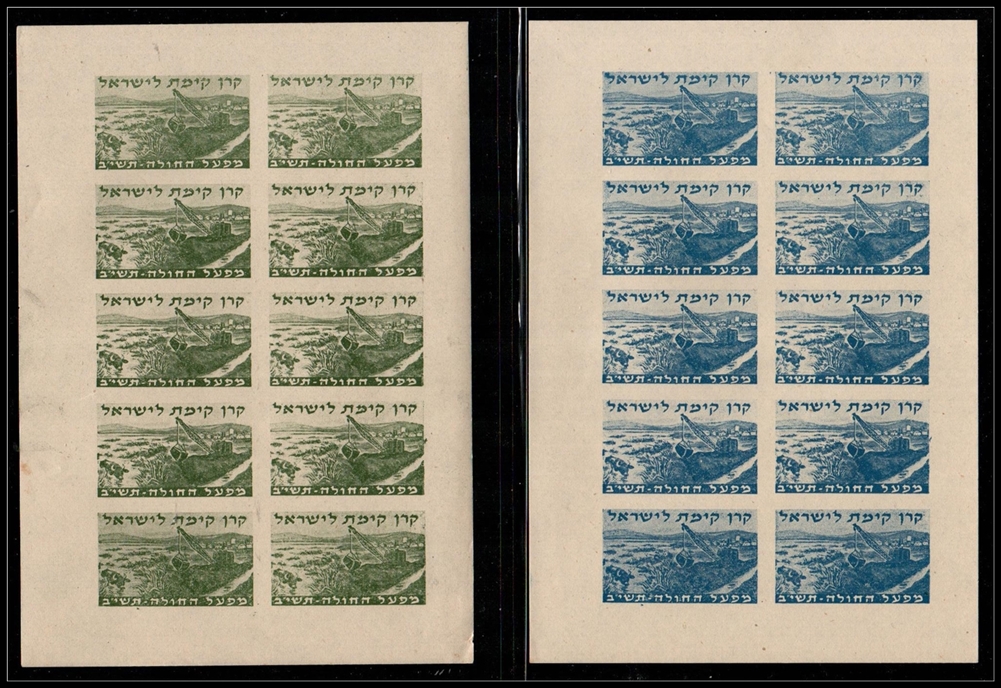 JNF 1952 Huleh Project Sheets (Rochlin 1407–1408)Two imperforate sheets (2 × 5) marking the drainage of the Huleh marshes, inscribed “Huleh Project, 5702.” Original gum, MNH.