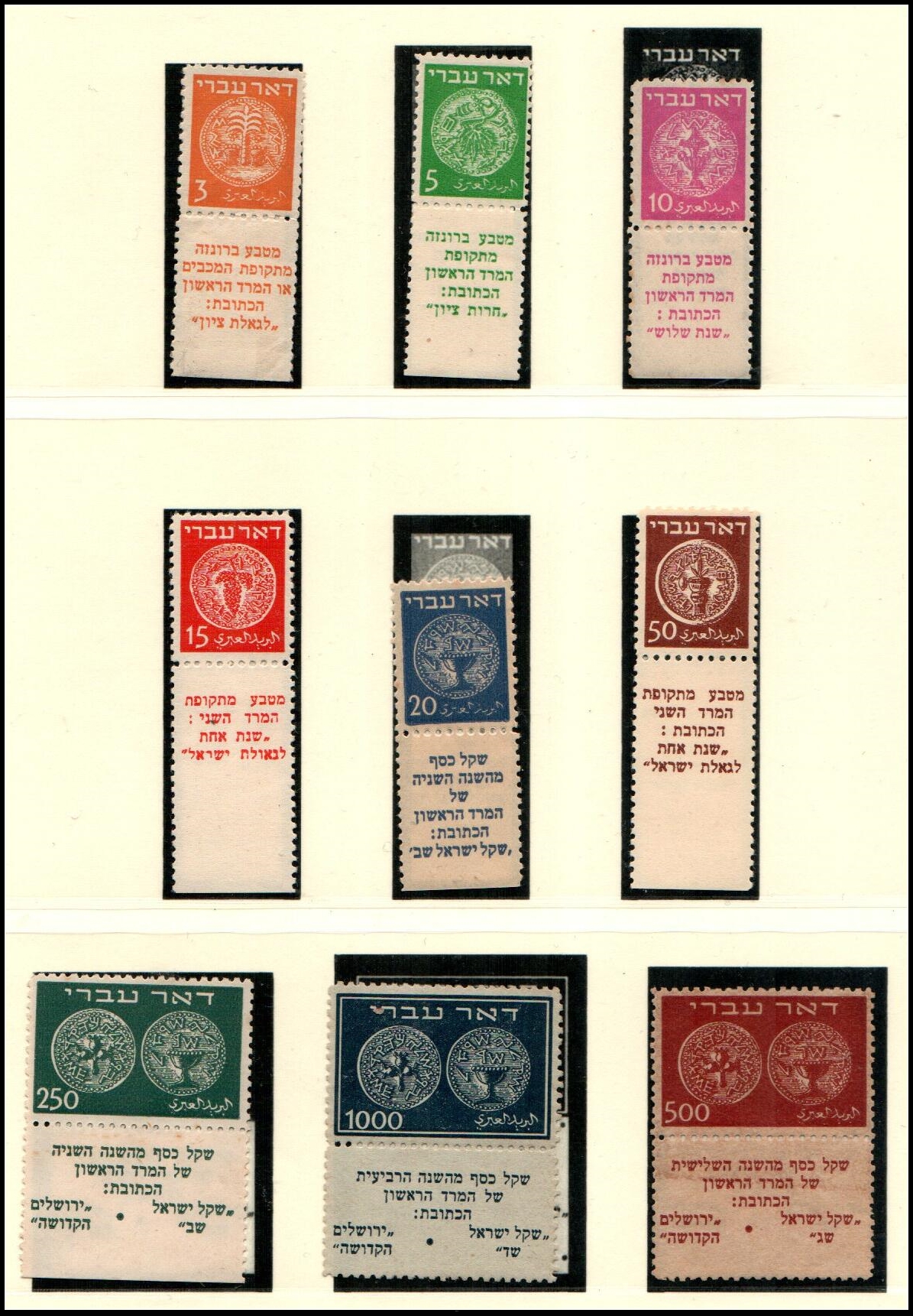 74 Unused , postcard   imageIsrael 1948 Doar Ivri, 3m–1,000m (Bale 1–9) Complete set of nine values, perf 11. Stamps 1–6, 20m, and 50m are neatly minted and hinged. The 250m with tab, along with the 500m and 1,000m, are mint never hinged with perforated tabs at the base as usual. Bright colors throughout. Very fine condition.