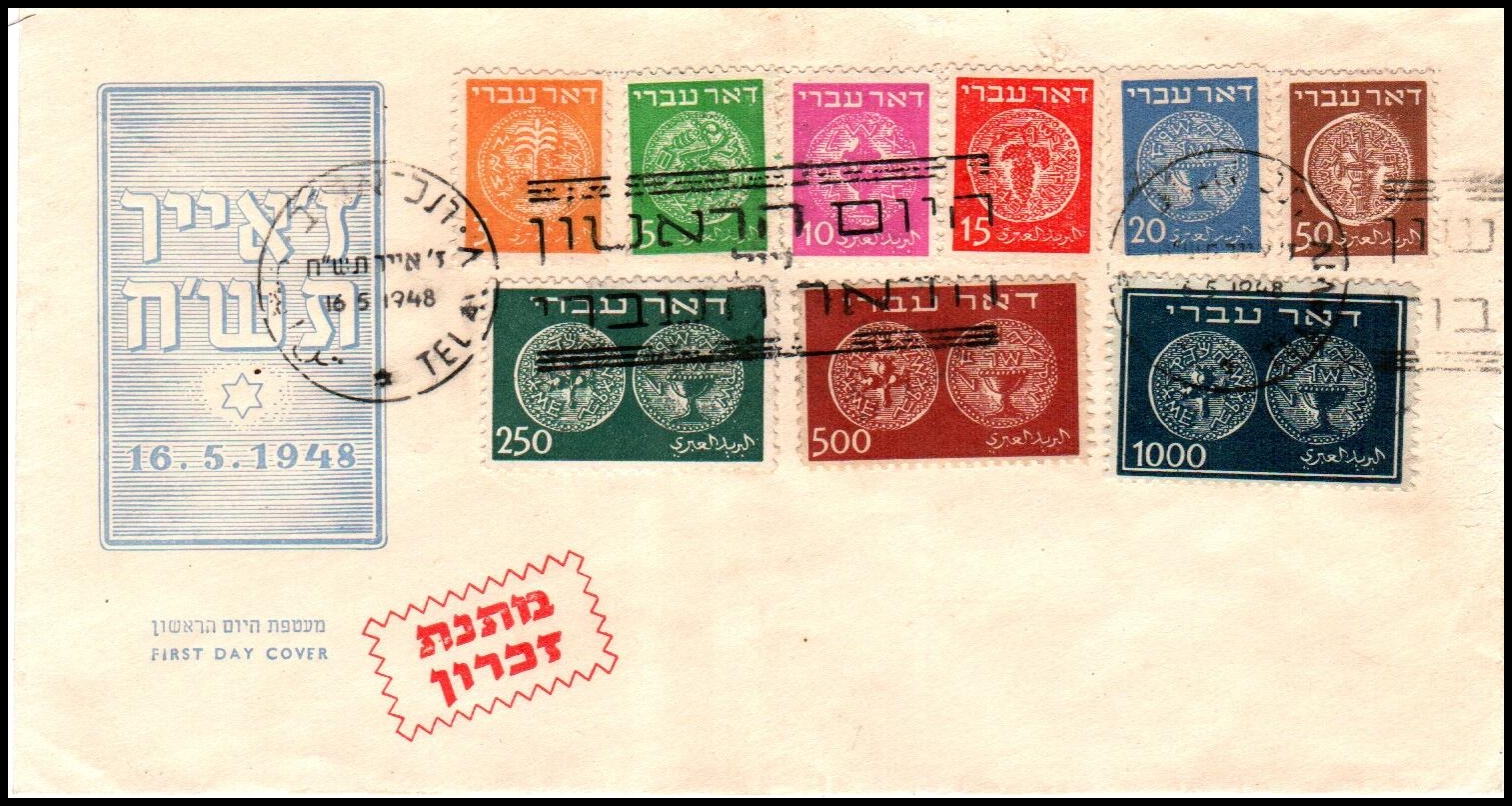 90 First day cover   imageISRAEL stamps 1948. Scott #1-9, Matanat Zikaron, unaddressed First Day cover.
