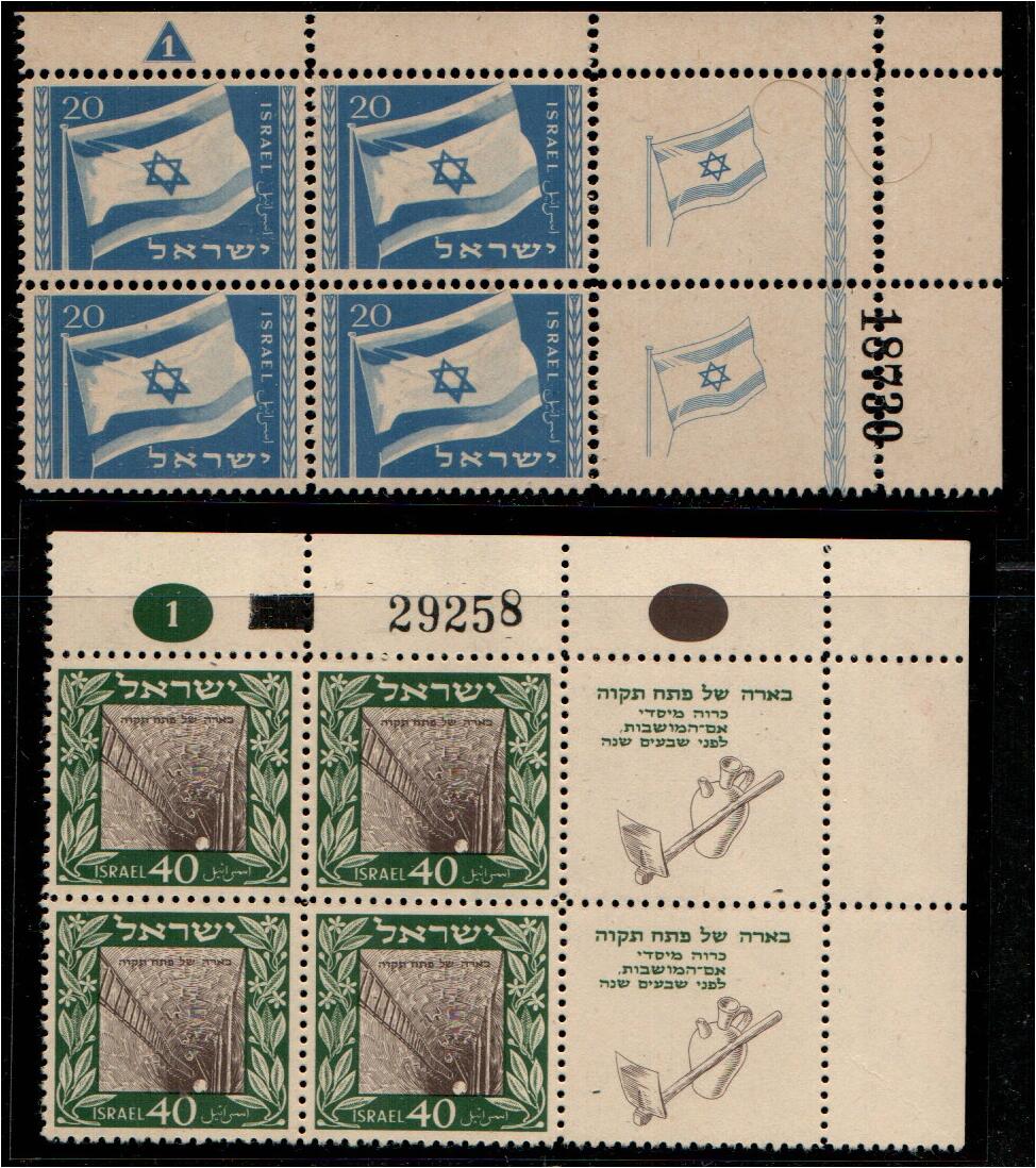 Israel 1949, Lot of two MNH plate blocks of 4, Flag 5m (Bale 16) and Petah Tikva 10m (Bale 17), all with intact left tabs. Fresh condition, original gum.