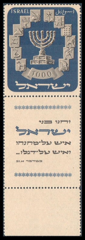 Israel 1952 Menorah 1000pr, Full Tab, MNH Scott #55, Bale #61. Left margin Full tab, MNH. S