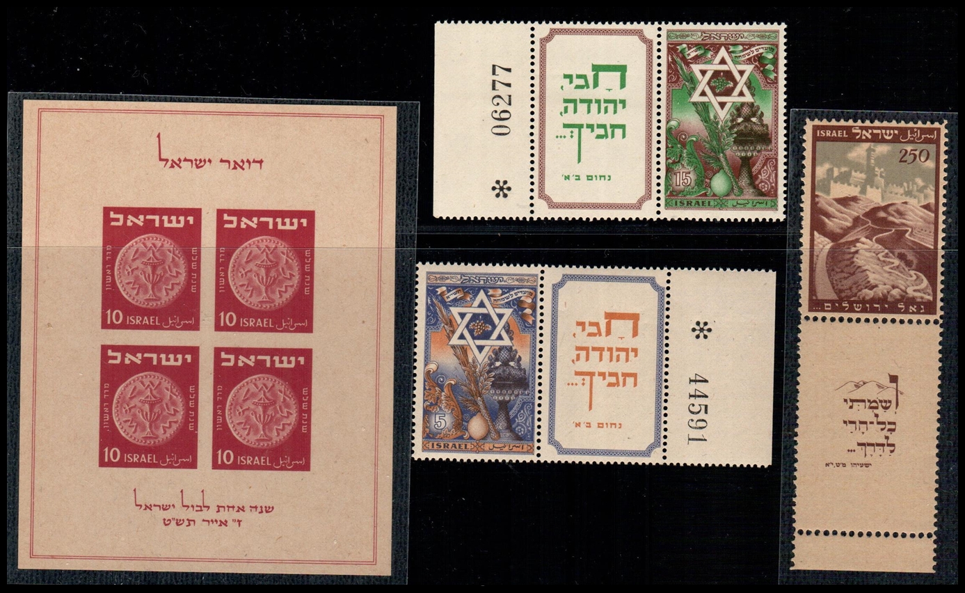 ISRAEL Stamps 1950 UPU Bale: 27/28, 27a/28a, 27b/28b w. full set of tabs, gutters, and tete beche & stamps with tabs. Mint Never Hinged