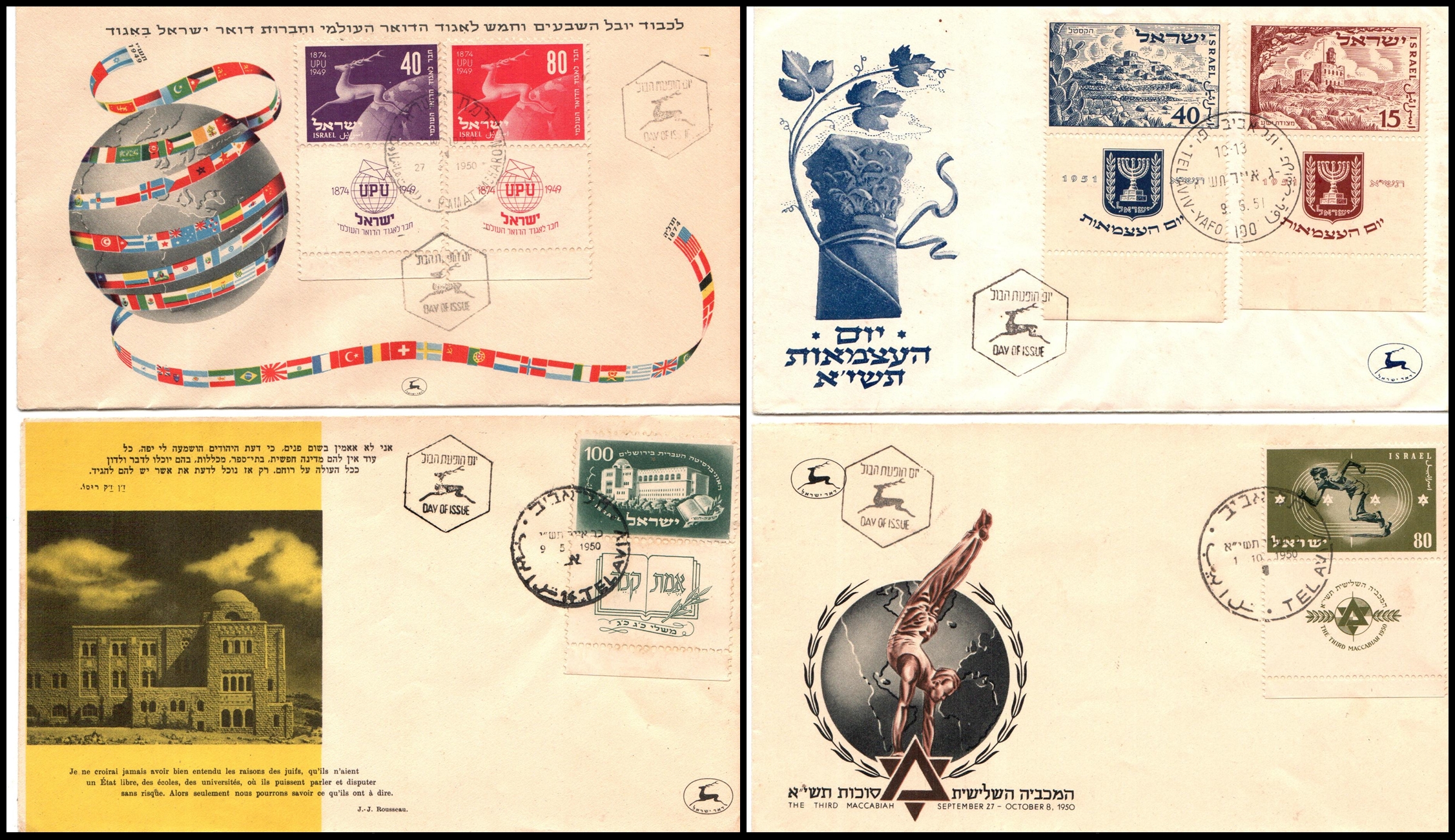 Israel, 1949–1951, lot of four different First Day Covers, each bearing the complete set in full tabs: