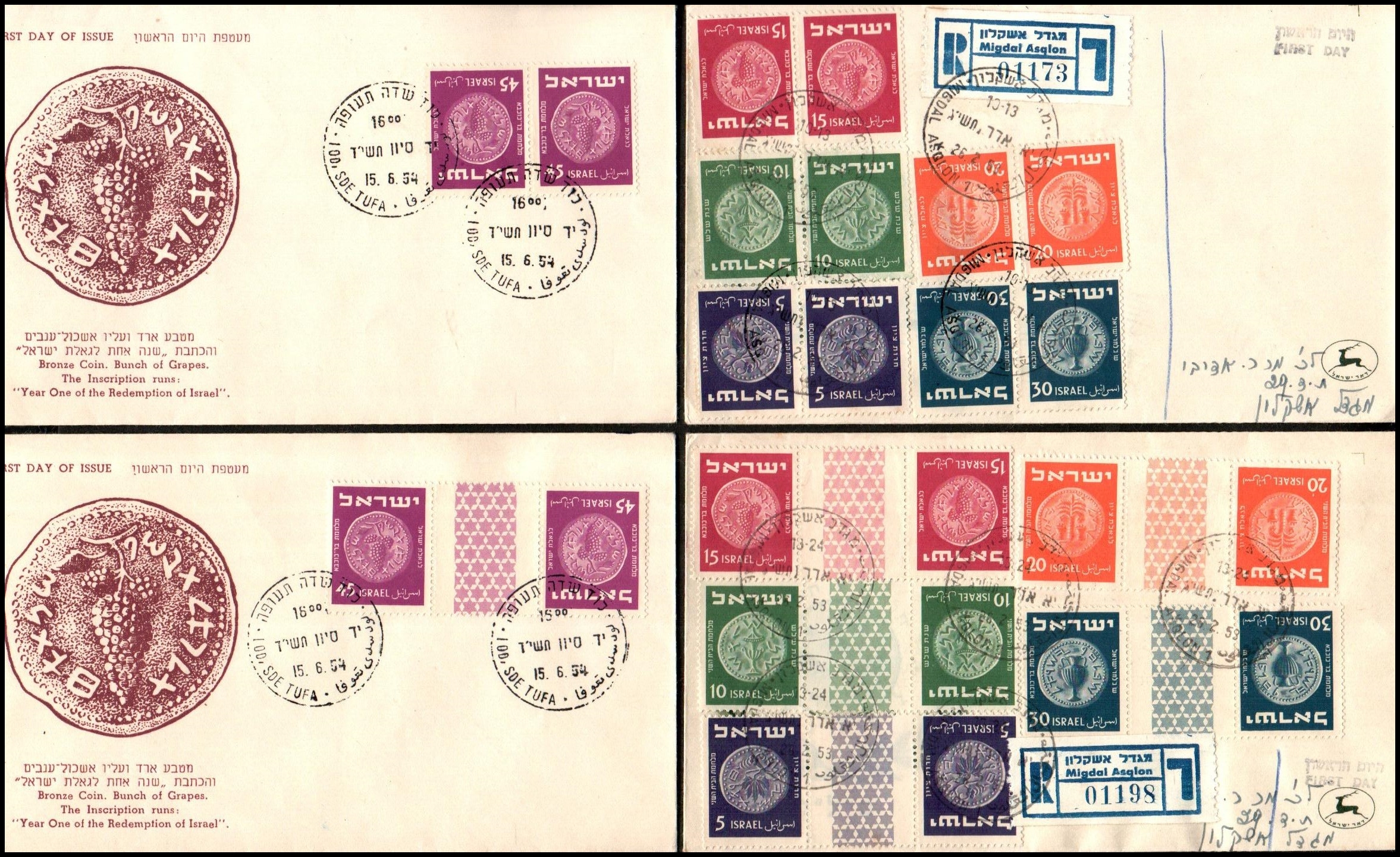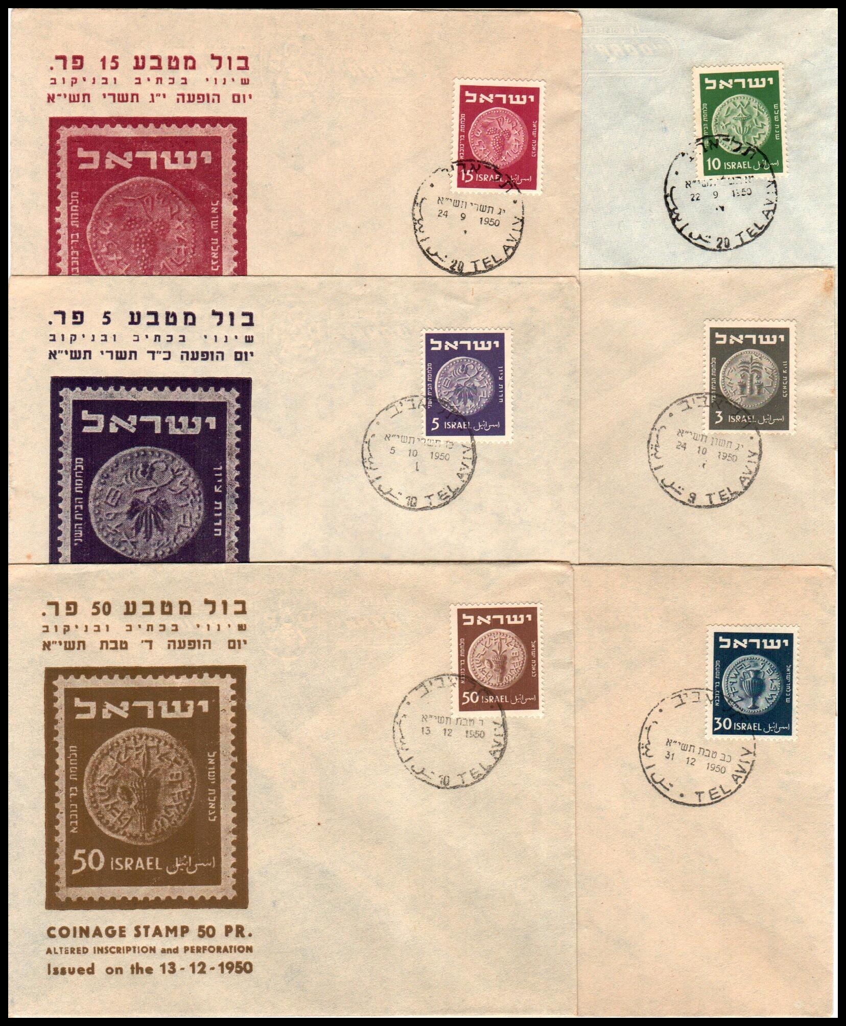 1950 Tel Aviv, Israel First Day cover FDC Coinage Stamp Bale: 41-46 Lot of two sets of 6 covers (each stamp on cover FDC), one set with tabs and the second with auth tabs. VF Cat $400++