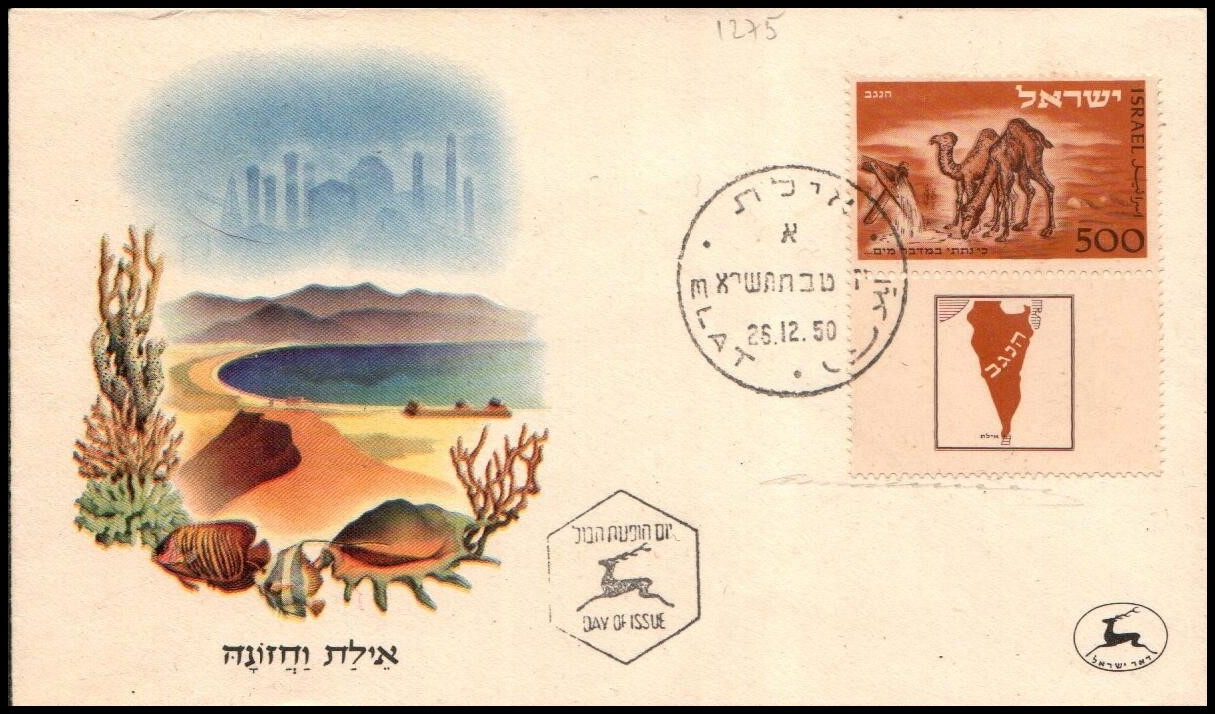 ISRAEL 1950 500 pr NEGEV (Sc.#23227), single with short tab (no selvedge) tied to official cacheted FDC by hand-stamped first day postmark ELAT 26.12.50.**** * OPINION: GENUINE in every respect and in excellent condition.