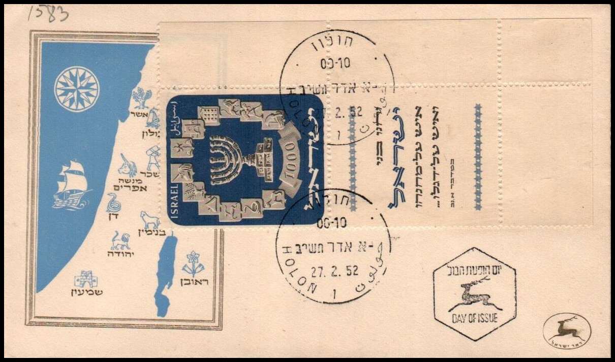Israel Bale: 59 1952 1000 Pr. L\margin Menorah UA FDC with TABs