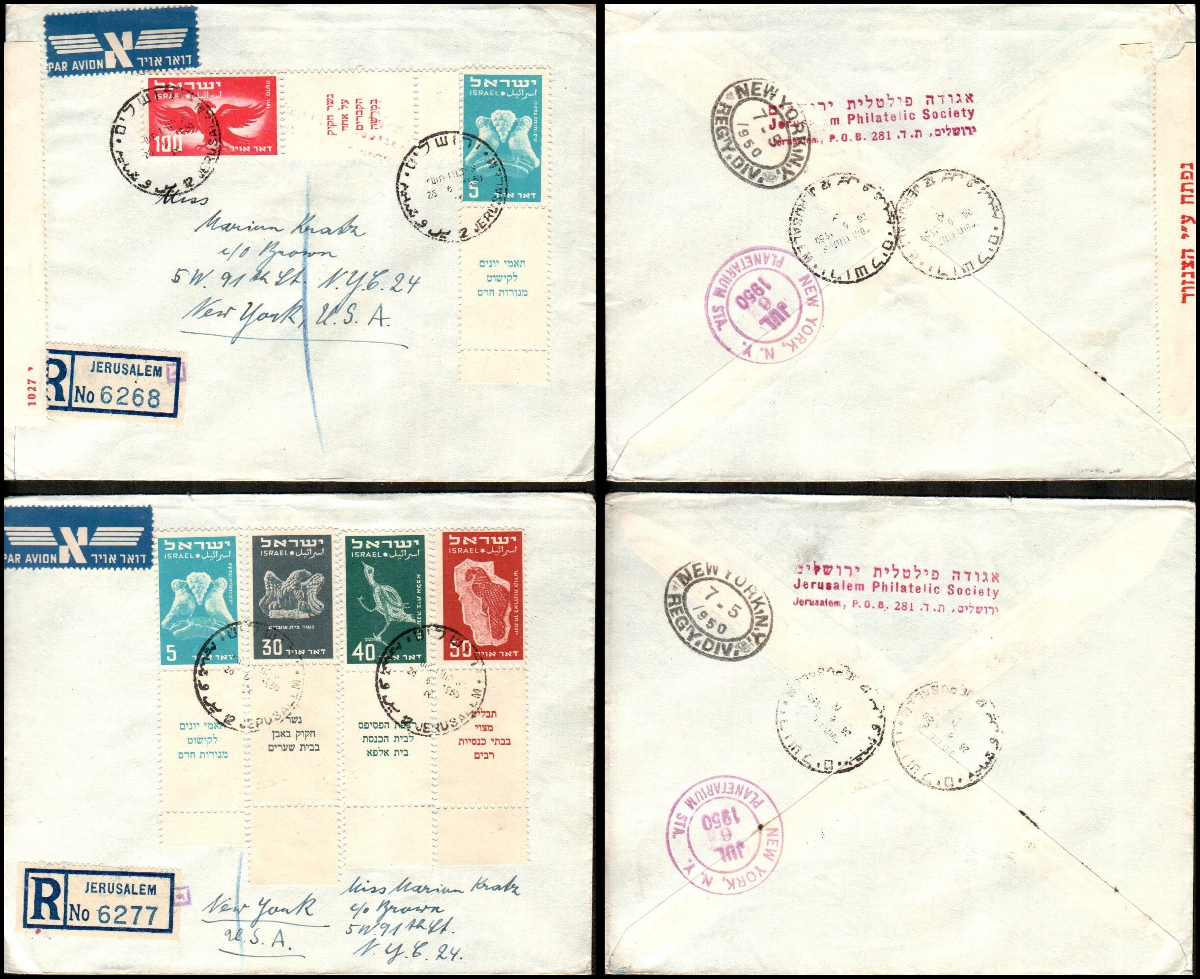 Airmails comp. set 6v with full tabs on three Regis, flown covers from JERUSALEM pmkd 26.6.51. to the USA. All steps are properly tied to covers, including an extra 5-pr tabbed. This is the first day of Sale to the public;