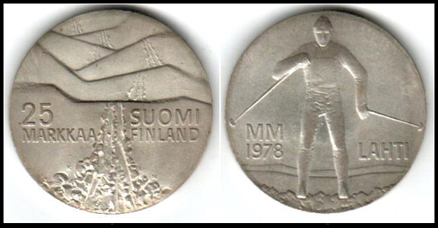 637 verygood , uncirculated   image1978 Finland 25 Markaa Skiing Championships 50% Silver Coin Grades MS BU UNC. KM # 56