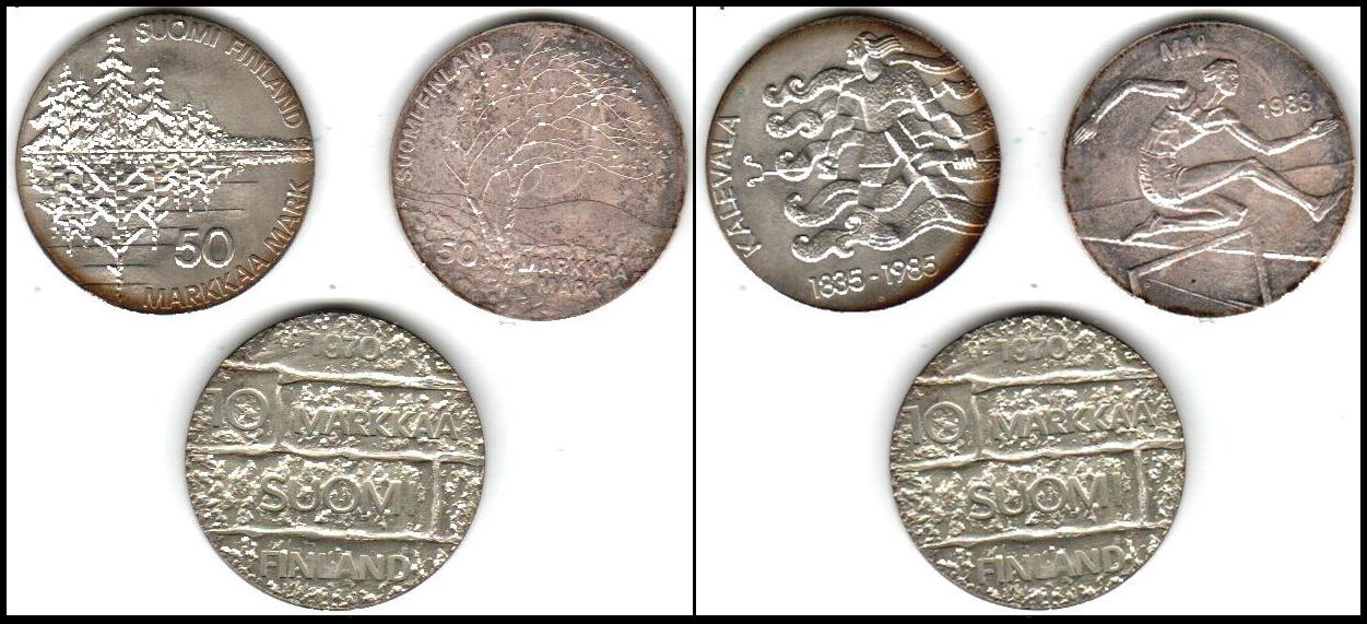 636 veryfine , uncirculated   imageFinland, a lot of 3 different coins, 1983-1985. 1970 SH Finland 10 Markkaas / Beautiful BU Silver Coin / KM# 51. Unc Finland - World Athletics Championships  1983 Silver 50 Markkaa 35mm (22.10 grams) 0.500 Silver (0.1929 oz. ASW) Reference: KM # 61. Unc Finland 1985 50 Markkaa Kalevala Origin KM #62 Silver UNC