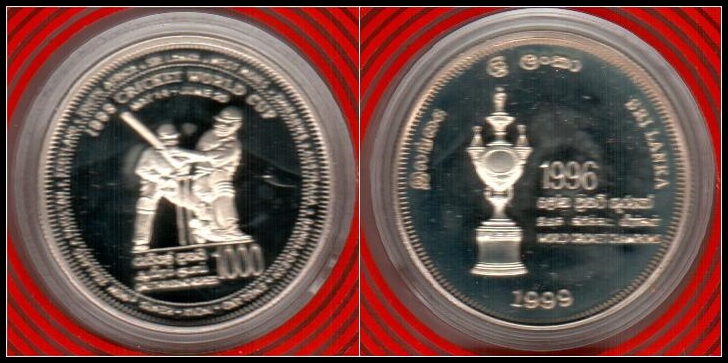 624 proof   imageSri Lanka KM # 159 1000 rupees Cricket World Cup Two Players in 1999, Description: Material: Ag 925, Weight (g): 28.28, Gross weight (g): 58.48, Diameter/Dimensions (mm): 38.61, Quality: Proof