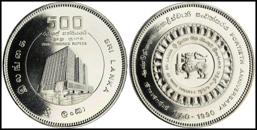 625 proof , uncirculated   imageSri Lanka KM # 150a Sri Lanka 500 rupees 40th Anniversary of the National Bank silver coin 1990 Material: Ag 925, Weight (g): 28.28, Gross weight 28.28g, Diameter/Dimensions (mm): 38.61, Quality: Proof.