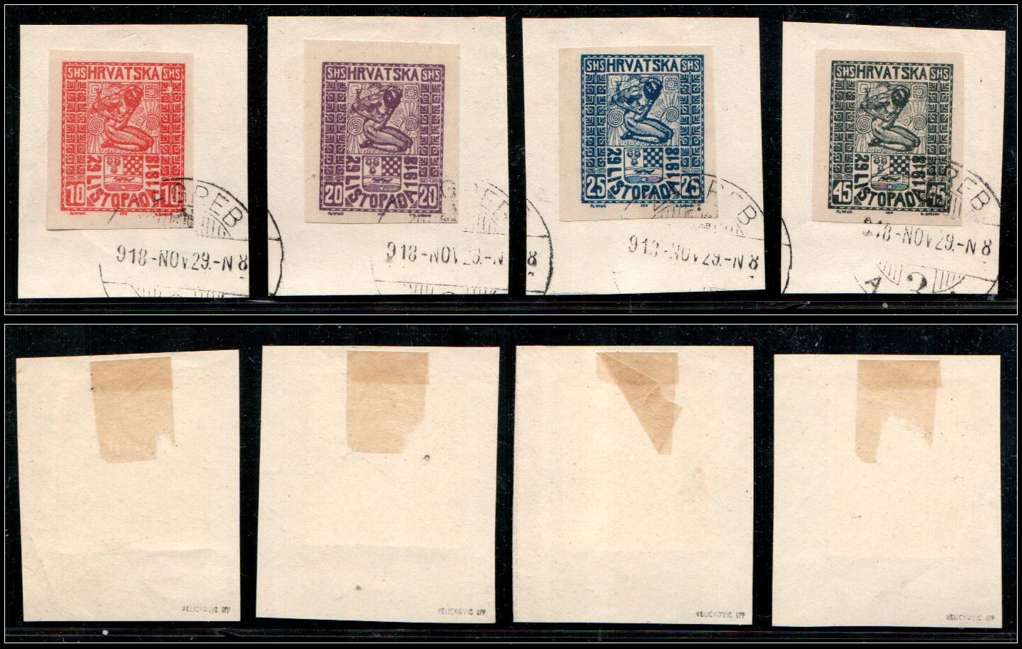 515 Used , veryfine   imageKingdom of Serbs, Croats, and Slovenes (SHS), or Yugoslavia, set of colour copies.Issues of the Post Office Directorate in Zagreb for the declaration of independence. Denominations 10, 20, 25, and 45 filler, imperforate on white paper with wide margins. Each stamp is individually cancelled “ZAGREB November 29, 1928.” Genuine stamps and cancellations as verified by expert phonetic examination.Signed on reverse and accompanied by a photo certificate, both by Dr Jovan Velickovic.