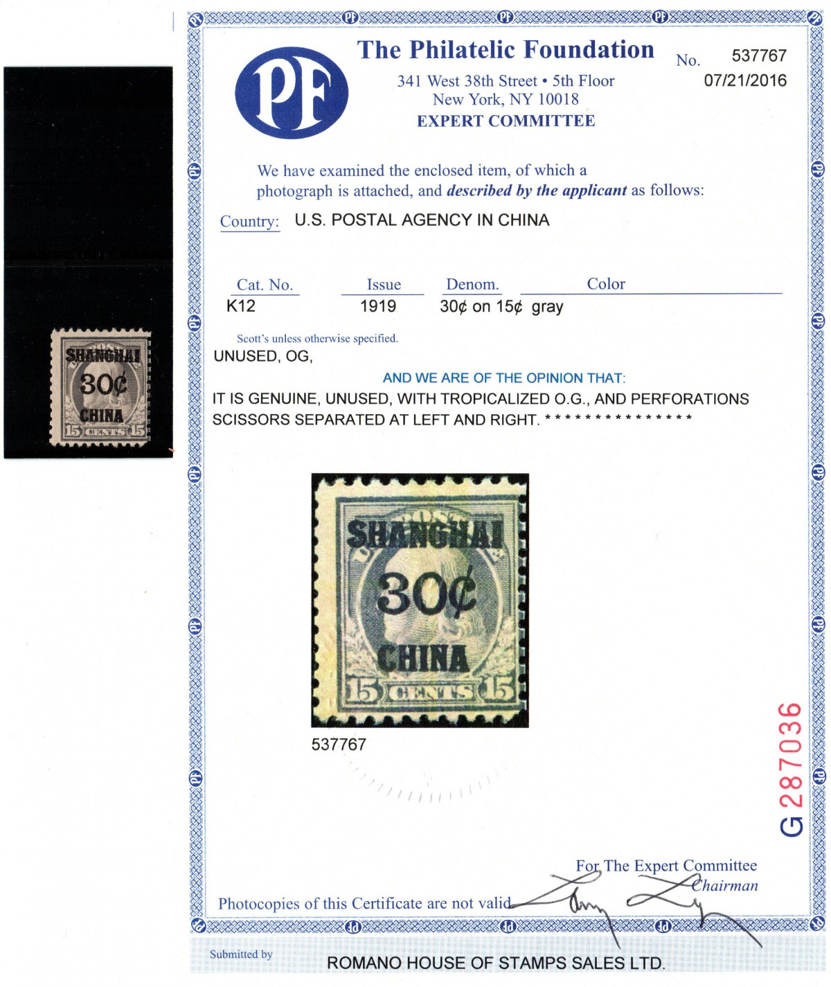 509 Front Cover , Used , veryfine   image1919, USA Offices in China, Scott K12. 30¢ on 15¢ gray,  strong color and impression. Flawless mnh. Scott  $200 2016 P.F. Certificate No 537767,