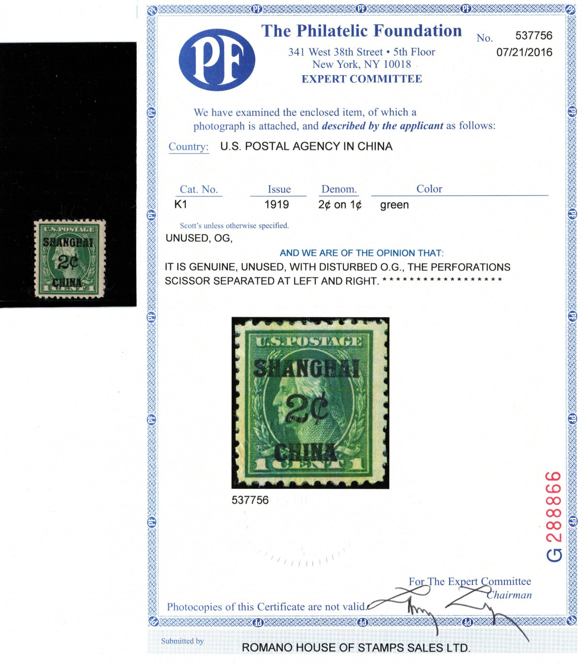 511 Mint Never Hinged   image1919, USA Shanghai  Scott K3 Unused w. disturbed OG, few blunted perf at lower right,  photo certificate PF NO- 537758. Cat.  $ 150 Estimate $150 – 200.