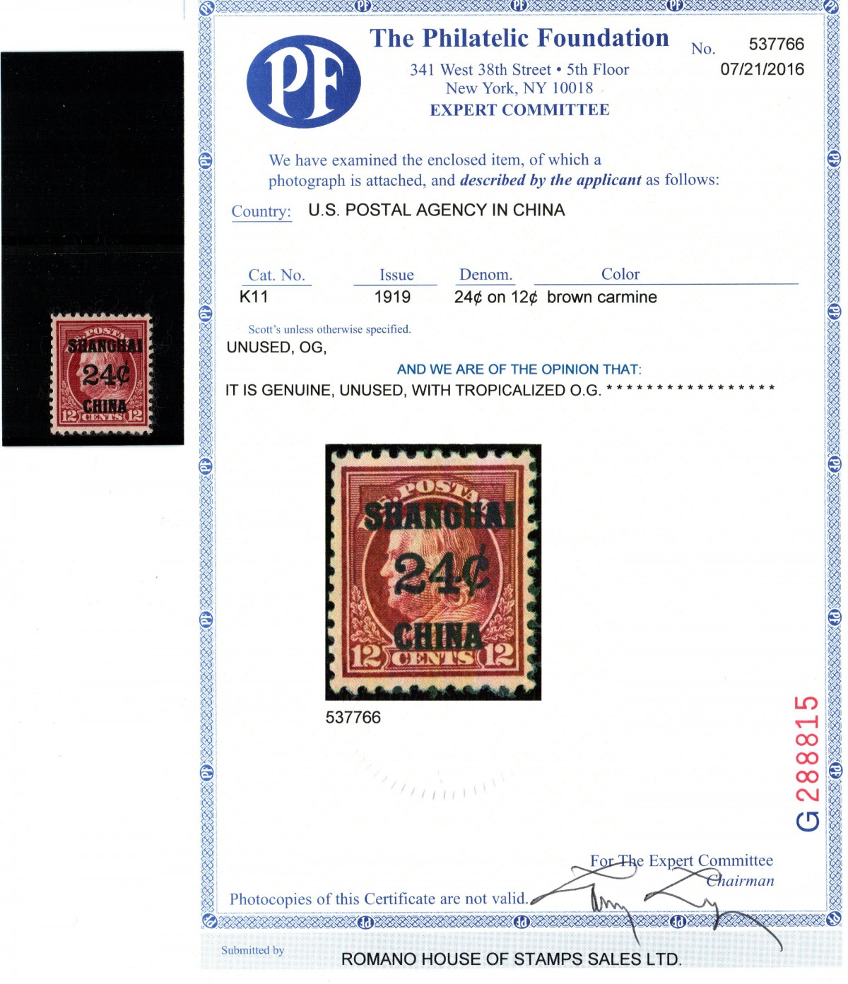 510 Mint Never Hinged   image1919, USA Offices in China, Scott K11. 24¢ on 12¢ brown carmine nice tall margins, vibrant rich color, unused, with tropicalized O.G. Very Fine .2016 PF. Certificate No. 537766. Scott $200. Estimate price $200 – 300.