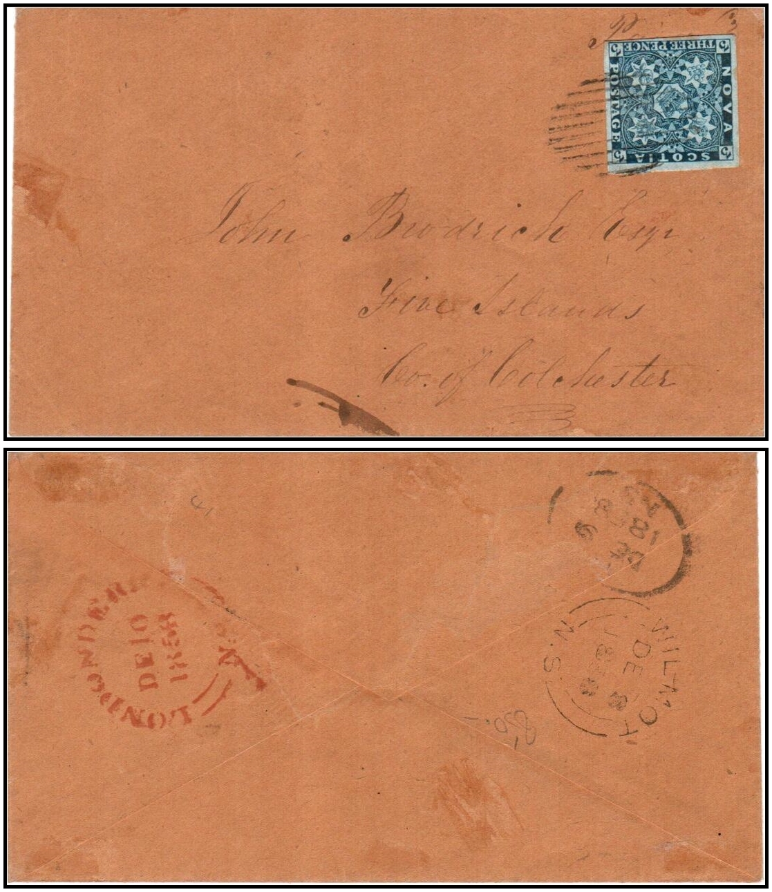 300 Cover , Used , veryfine   imageNova Scotia, 1858, inland cover to Colchester1858 folded letter from Wilmot to New Annan, Colchester County, franked at the 3d inland rate with a fine example of the 1851 3d bright blue on bluish paper, first printing (SG 3), tied by grid cancel. Clear "LONDONDERRY N.S. DE 10 8" circular date stamp alongside.