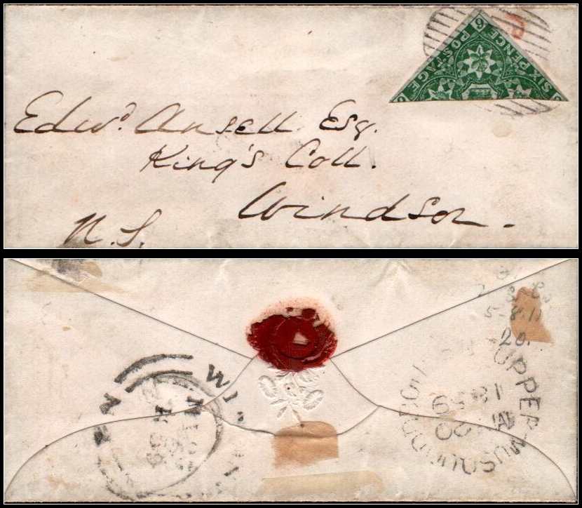 298 Cover , Used , veryfine   imageNova Scotia 1851–60 6d yellow-green (S.G. 5a), diagonal bisect used provisionally to pay the 3d domestic rate, tied by mute oval grid cancel to envelope addressed to Edw. Ansell Esq., King’s Coll., Windsor, N.S. The bisected stamp boasts close to strong and large margins. The reverse shows a legible Upper Musquodoboit dispatch cancel dated May 1859, confirming its origin in the Musquodoboit Valley, east of Halifax. Additionally, as well as an arrival backstamp cancel. Red wax seal on flap.. With Royal Philatelic Society London photo certificate. Estimated value £1,000–1,500. A comparable bisect cover (Feb. 1860, tied by oval grid cancel, with transit and arrival backstamps) realised £1,000 at Spink. SG £5,000 on cover.