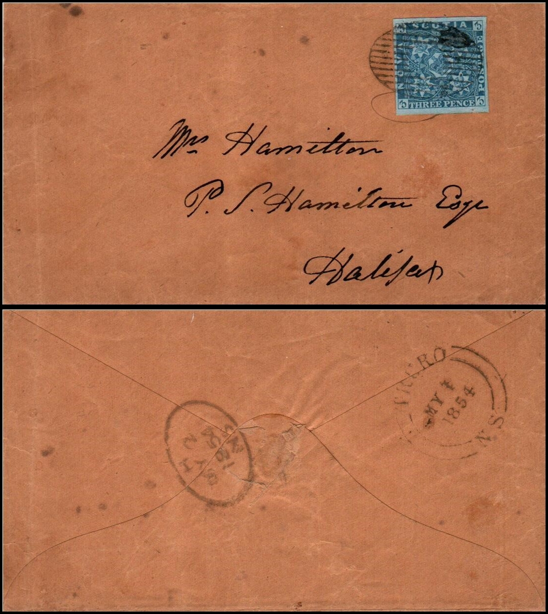 299 Cover , Used , veryfine   imageNova Scotia, 1854 cover from Truro to Halifax, franked 3d Dark Blue (SG 3) with near-perfect margins, paying the domestic rate, tied by a crisp mute grid.