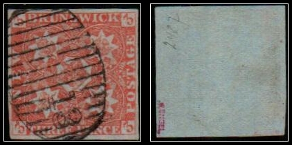 294 Used , veryfine   image1851 New Brunswick #1, 3d bright red on blue heavy woven paper. A striking example of this iconic imperforate issue, cancelled by a bold framed oval grid ‘18’ numeral. Characteristic uneven margins—narrower at top and right, balanced by wider bottom and left sides—add to its authentic period appeal. As was typical of early imperforates, the stamp was hand-cut from sheets, giving each example a unique visual presence. Expertly signed on the gum side by W. Engel, certifying its authenticity. Catalogued by Stanley Gibbons as SG 1 (£350 / approx. USD 550).Estimate: USD 400–550.