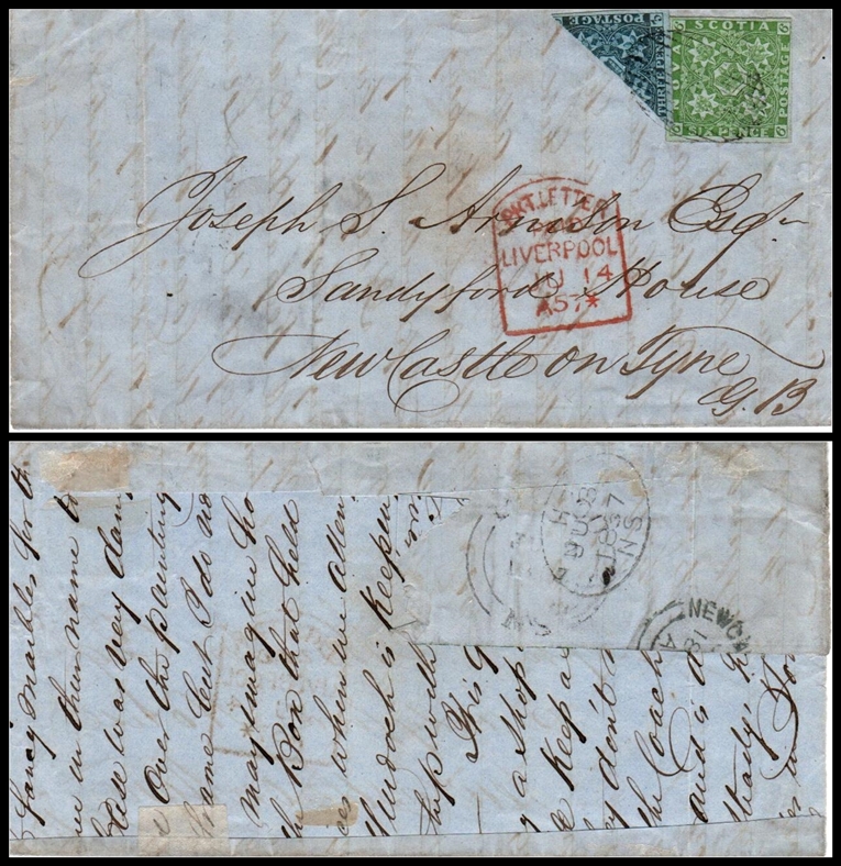 297 Piece , Used , veryfine , Sheet Letter   image1857 Nova Scotia “House Cover” to England, Bearing 3d Blue Bisect & 6d Yellow-Green — Correct 7½d  Rate Cat $7200. 1857 folded letter to Newcastle-on-Tyne, franked with a bisected 1851–57 3d deep blue on bluish paper (SG 2a), used as 1½d, and a 6d yellow-green on bluish paper (SG 5), both imperforate. The stamps are cancelled by a framed oval grid in black. On the front, below the stamps, is a red ‘PKT. LETTER / PAID / LIVERPOOL’ tombstone datestamp dated 14.6.57. Backstamped with Nova Scotia and Newcastle-on-Tyne datestamps. This franking represents the correct 7½d rate, the standard single-letter charge to the UK. As there was no 1½d adhesive available, the Postmaster General authorised the use of bisected 3d stamps on October 19, 1854. The 3d deep blue bisect is recorded in only three combinations for making up this transatlantic 7½d rate. A visually appealing and scarce bisect usage, despite the reduced back, and an important addition to any serious collection of Nova Scotia postal history. The term “House cover” in this context refers to a specific and well-known 1855 Nova Scotia cover sent by the firm Blackwood & House, a Halifax-based mercantile company. These covers were addressed to their partner office in England and are notable because several early bisect usages—especially of the 3d blue bisect + 6d green to pay 7½d—were sent by or to this firm. So when philatelists say “House cover”, they’re referring to: A genuine, commercial usage of bisected Nova Scotia stamps, Usually mailed by Blackwood & House, And often considered part of the earliest known examples of the authorised bisect practice after the 1854 PMG directive. These covers are among the few documented and accepted uses of the bisect to make up the UK letter rate. Because they originated from a known sender, they're used as benchmarks for authenticity and proper usage. There are only a handful known - hence the high auction values and collector interest. P.A. Expertising Limited.