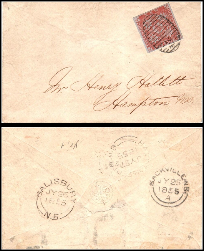 293 Cover , Used , veryfine   imageNew Brunswick: 1855 envelope to Hampton, franked with 1851 3d dull red (SG 2), tied by crisp Sackville "200" barred numeral, with clear backstamps of Sackville JU 25 1855, Salisbury JU 26, and Hampton Ferry arrival JU 27. A clean and attractive cover, certified by B.P.A. Expertising Ltd., London, with accompanying photographic certificate. Cat. £800.