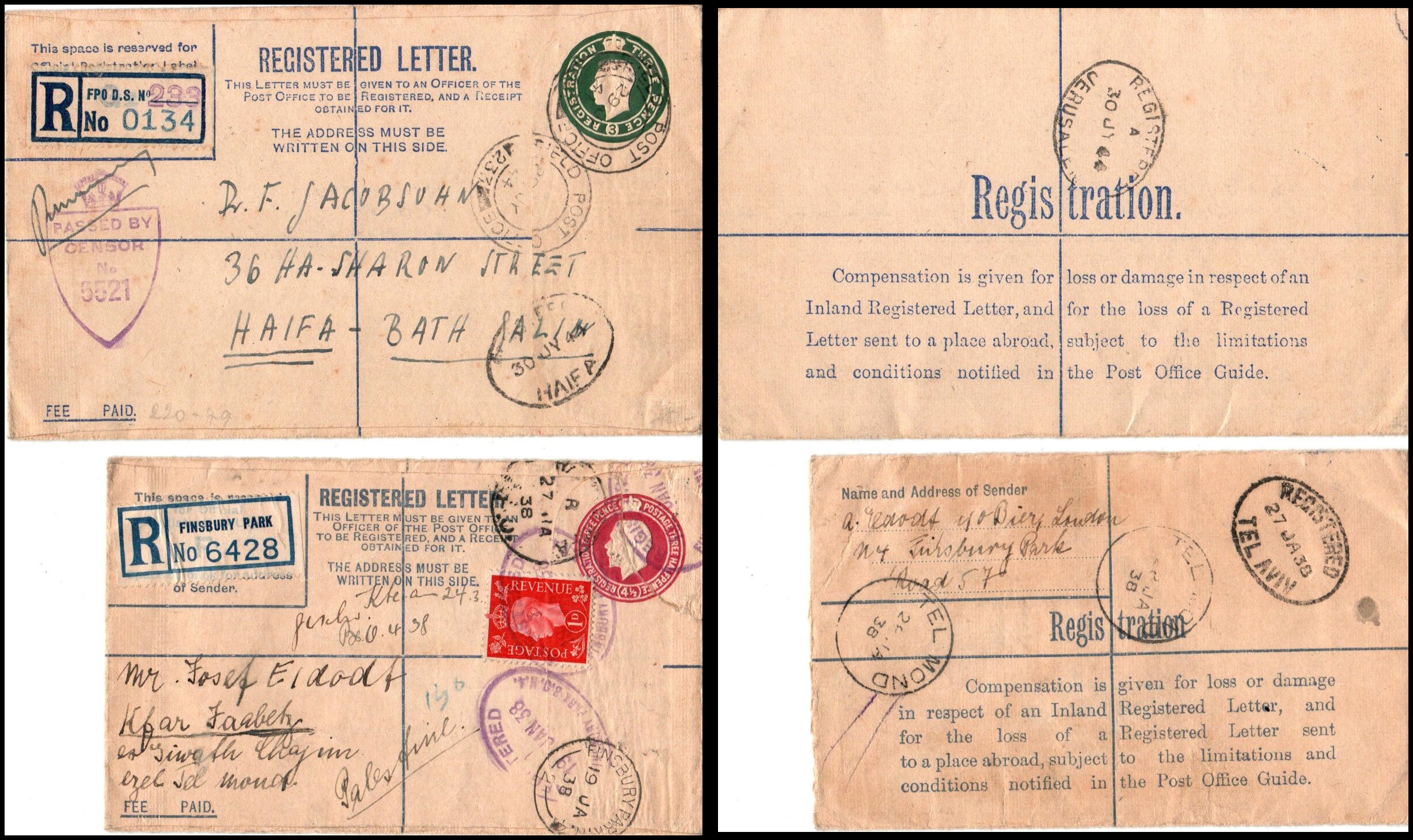 43 Cover , veryfine   image1938 lot of to Field-post REGISTERED-LETTER one sent to Tel- Mond and second to Haifa Bat Galim.GREAT BRITAIN 1944 WWII From FPO D.S No 233 Censored Registered Cover to ISRAEL Haifa Bat Galim
