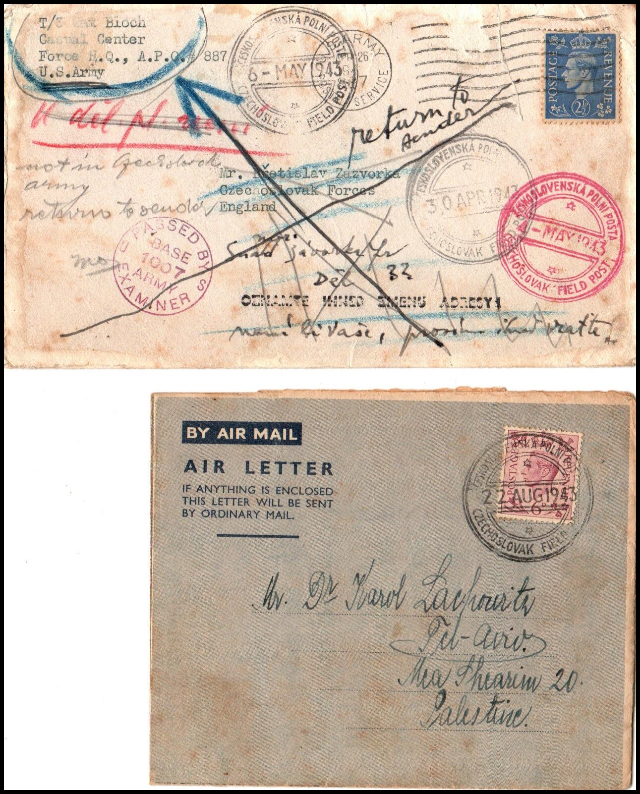 42 Airmail cover , veryfine   imageLot of two covers. (1) Airmail dated August 22, 1943, probably during World War II, with the stamping of (Czechoslovak Field). The letter is addressed to Dr. Nachum Lachowitz in Jerusalem, at 20 Mea Shearim Street. Palestine. (2) Old envelope with a Czechoslovak postmark and handwritten text. The letter was probably sent during or after World War II. The letter was sent on May 6, 1943. It was sent by a person named "KETISLAV ZE ZUZVORKA \ growled Czechoslovak forces in England.One of the stamps indicates ARMY ISKA POLNIA POSTE Military Field Post.The letter was sent to a military unit of the US Army.(Center C, Force 8. A.P..887.Q US Arm