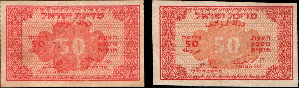 762 veryfine   imageIsrael lot of two 50 Pruta diff signatur 1952 P# 10a & 10c  Eshkol Zaggy & Kaplan Zaggy . used VF