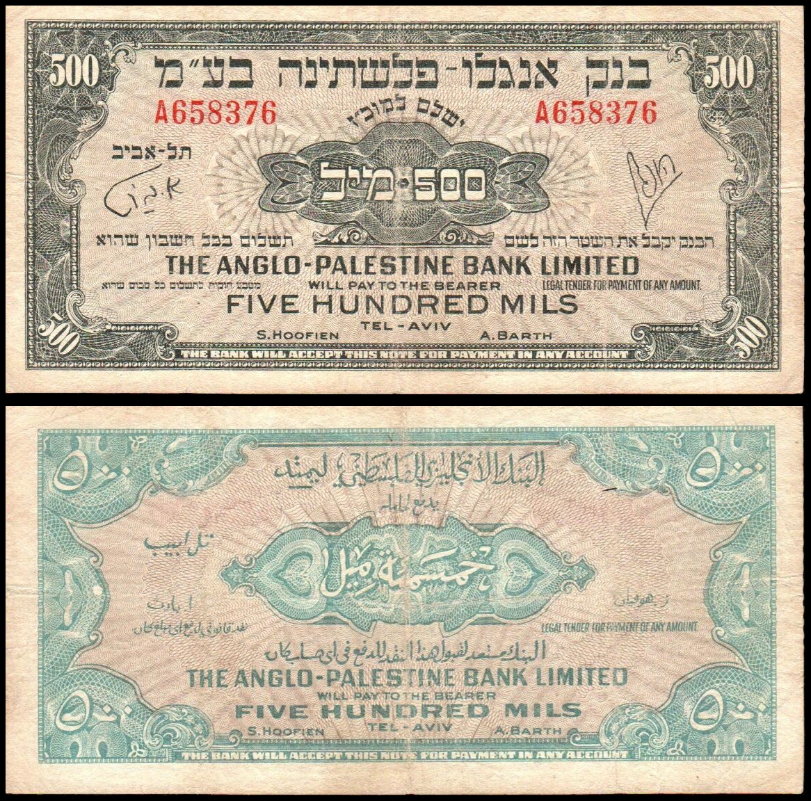 764 verygood   imageIsrael 1948-51, P-14, 500 Mils, 1948 Anglo Palestine Issue  S/N A658376.  VF