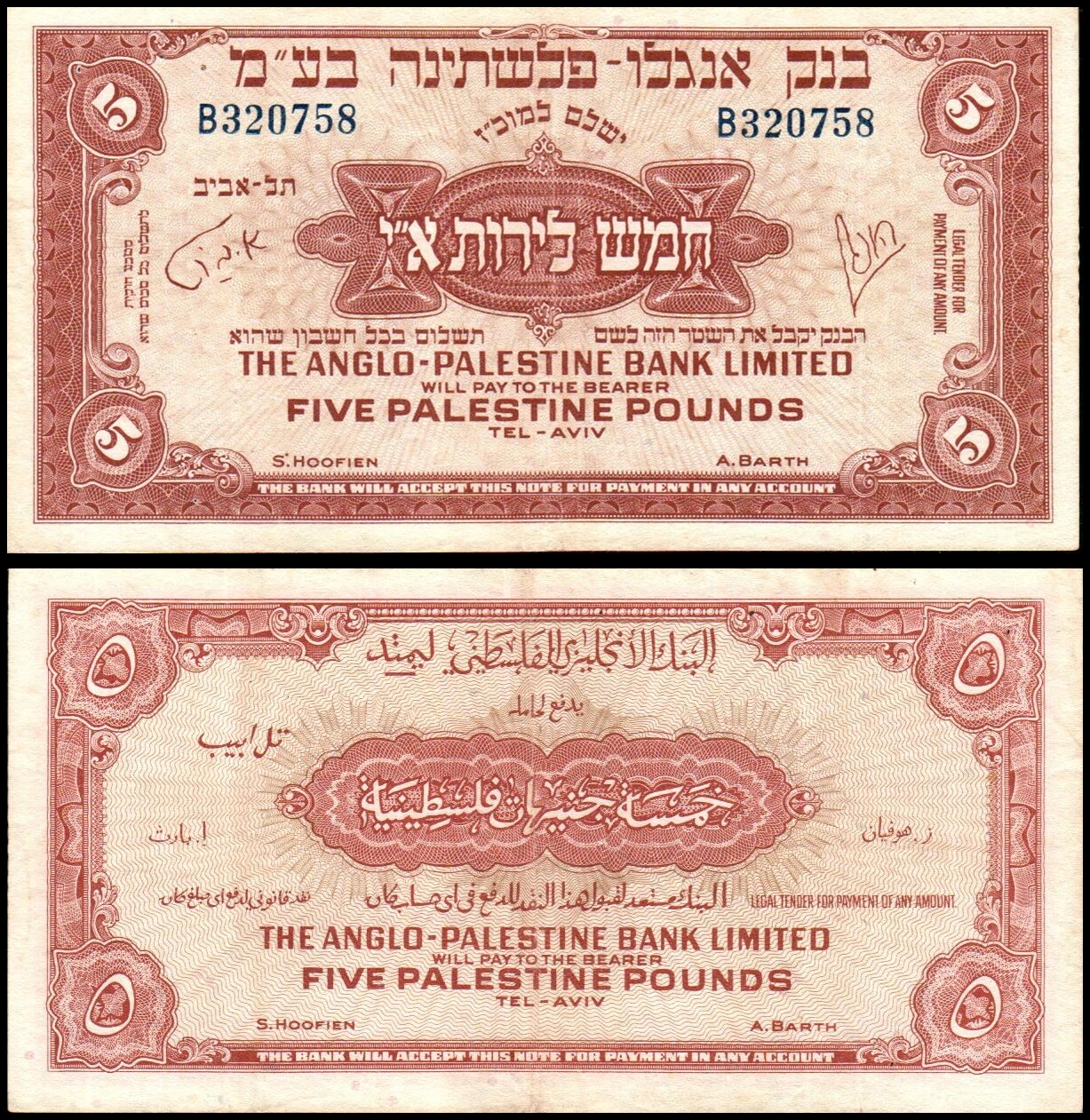 763 verygood   imageIsrael 1948-51, P-16, 5 Pounds, 1952  Anglo Palestine Issue  S/N B320758.  AU